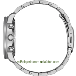 Movimiento de cuarzo Eco-Drive. Calendario, cronógrafo, cristal mineral. Caja y pulsera de acero.