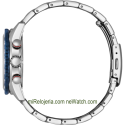 Movimiento de cuarzo Eco-Drive sin cambio de pila. Calendario, cronógrafo, cristal mineral. Caja y pulsera de acero.