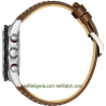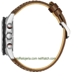 Movimiento de cuarzo Eco-Drive sin cambio de pila. Calendario, cronógrafo, cristal mineral. Caja de acero y correa de piel.