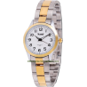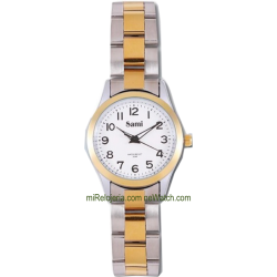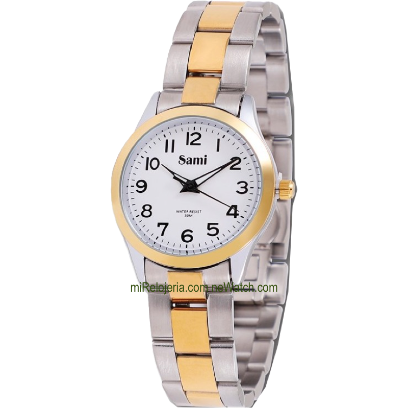 Movimiento de cuarzo MIYOTA, caja de metal y pulsera de acero bicolor.