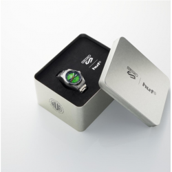 La parte posterior de la caja de exhibición presenta el mismo "HUF Green" que la esfera y está decorada con un gráfico inspirado en San Francisco, la ciudad donde se fundó HUF.