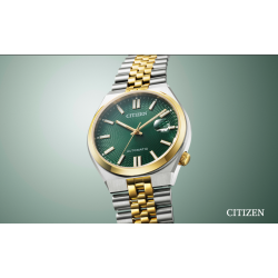 Movimiento mecánico automático con carga manual. Calendario con lupa, fondo transparente a rosca. Cristal zafiro. Caja y pulsera de acero.