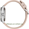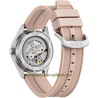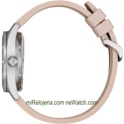 Movimiento mecánico automático, calendario, fondo y corona a rosca. Cristal Mineral. Caja de acero y correa de poliuretano Pink.